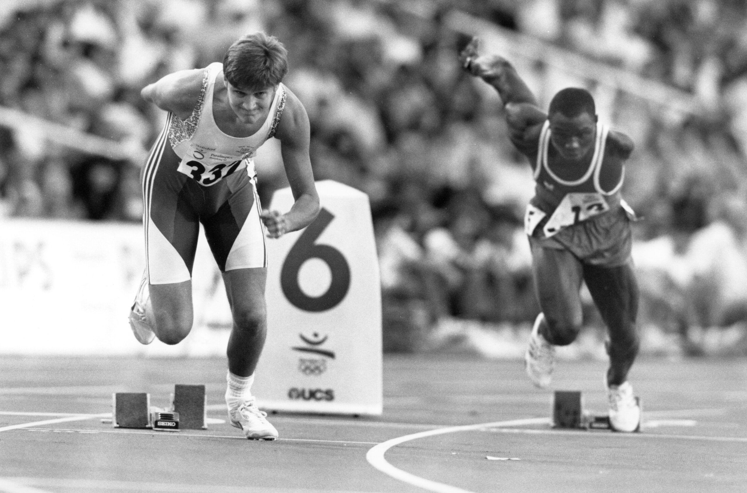 2GGC4TM Barcelona Spain, 1992: Paralympic Games, runners competing in category for men missing an arm take off from starting blocks in the 400 meter race at Estadi Olimpic. ©Bob Daemmrich