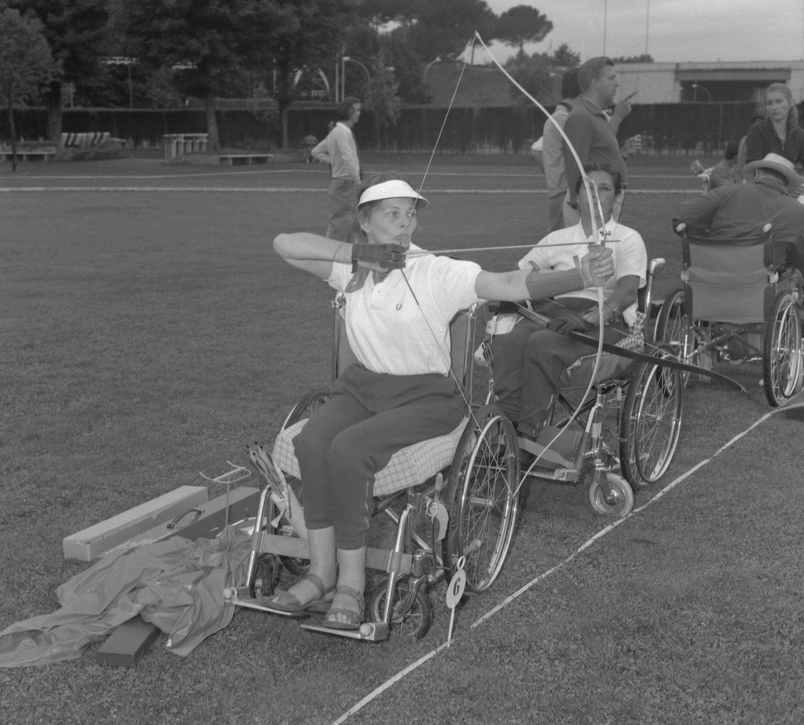 2N8JFEA Britain's Kathleen Comley from Charlwood, Surrey sights up the target as she competes in the Archery contest at the Paralympic Games, also known as the Paraplegic Games in Rome, Italy on Sept. 19, 1960. Some 400 disabled sports men and women from 22 nations are taking part in the games. (AP Photo)