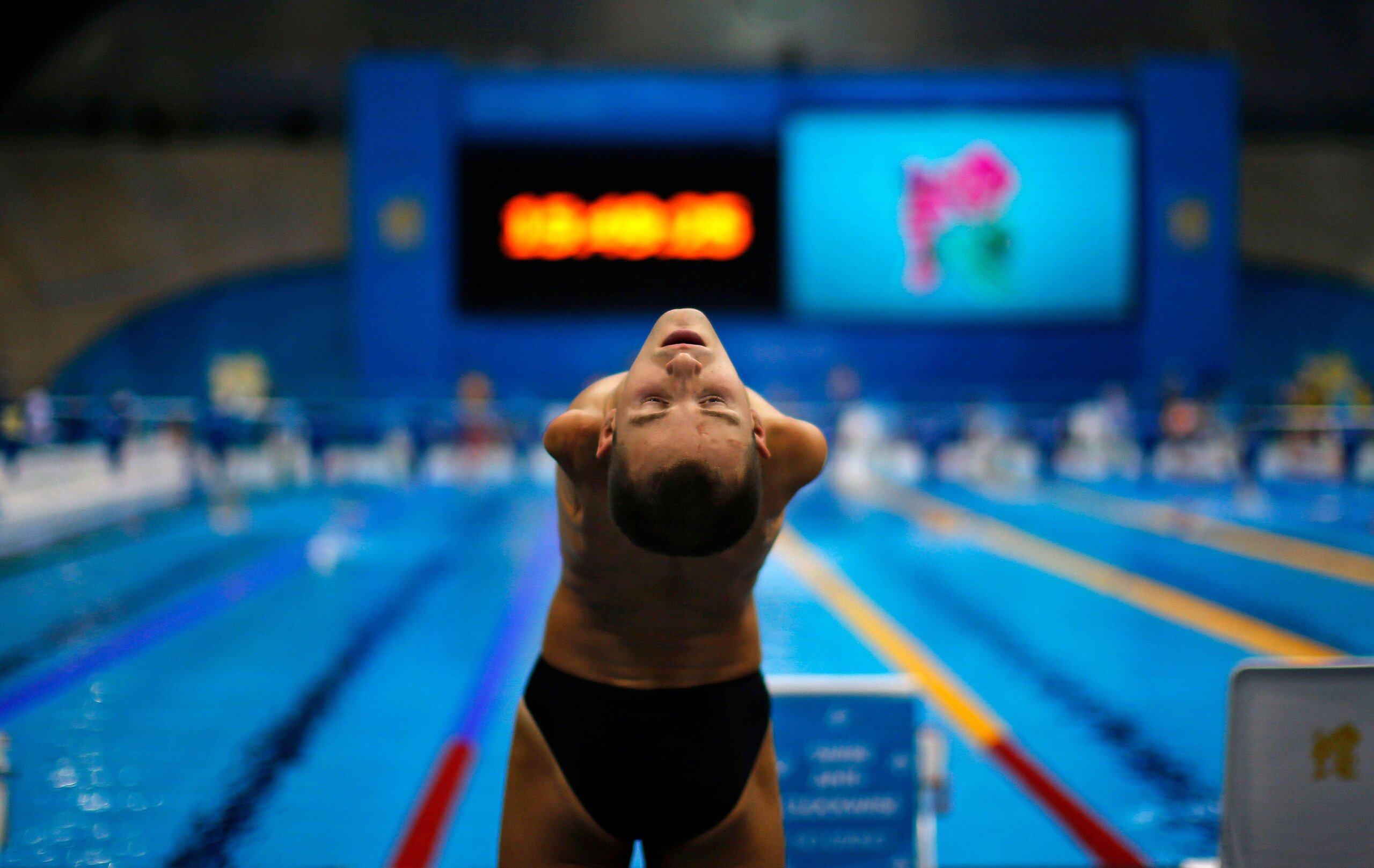 2P66YYK Ukraine's Laroslav Semenenko stretches ahead of Men's 100m Backstroke S6 category at the 2012 Paralympics Olympics, Thursday, Aug. 30, 2012, in London. (AP Photo/Emilio Morenatti)
