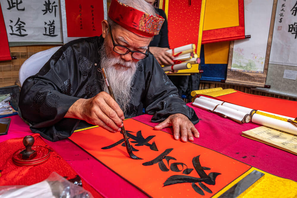 A real person doing something real. A calligrapher writing with ink during the Tet festival in Hanoi, Vietnam 14th February, 2024. Photograph: Jean-Yves Bardin