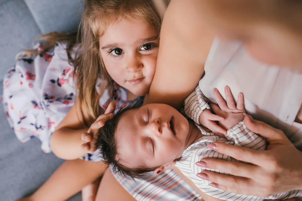 A real moment that feels real. Mother holding her baby close with sister feeling his hair. Photograph: Mareen Fischinger / Westend61 GmbH