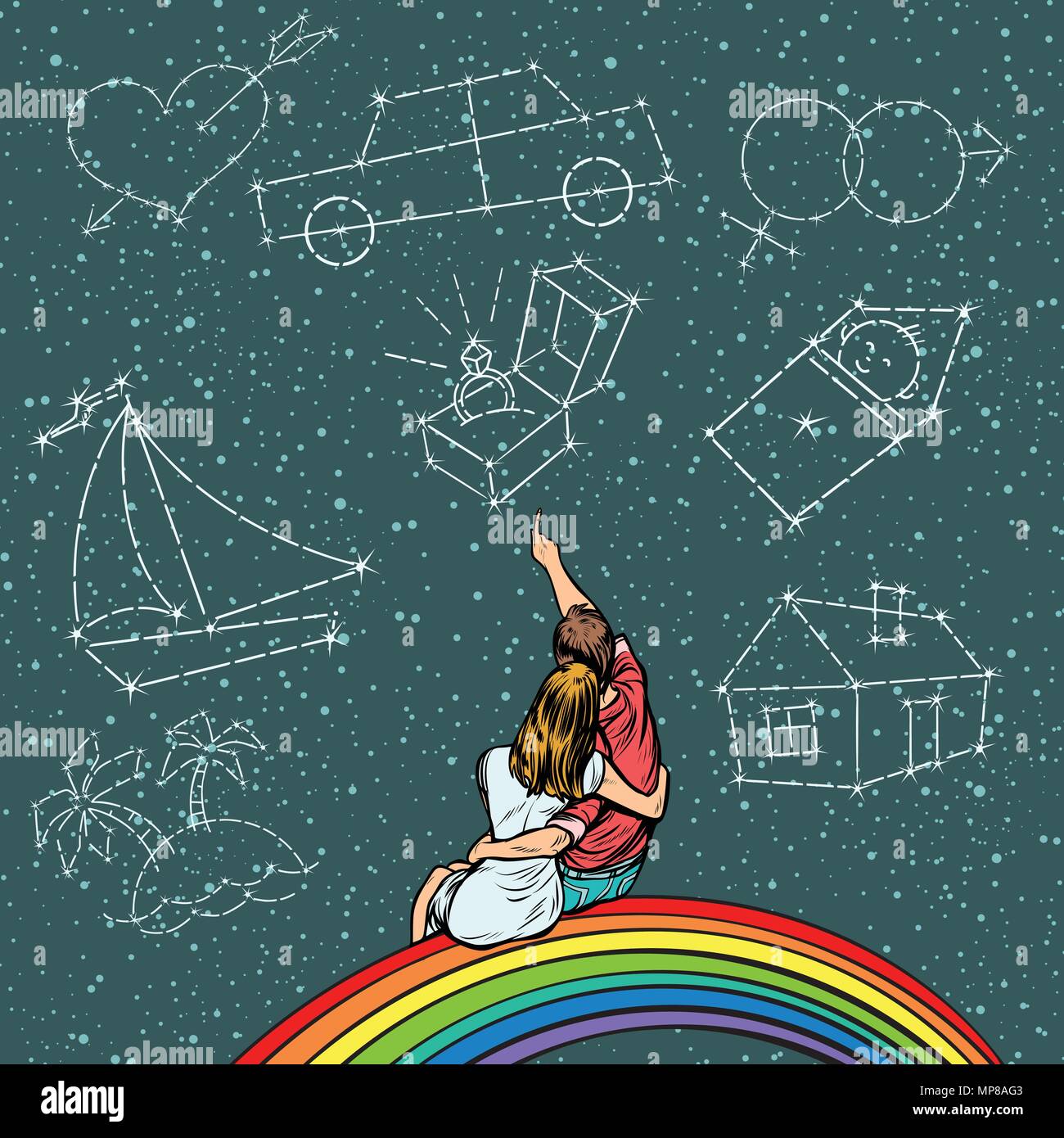 Family couple man woman dreams of the future. Lovers sit on a rainbow and look at starry sky. Pop art retro vector illustration kitsch vintage