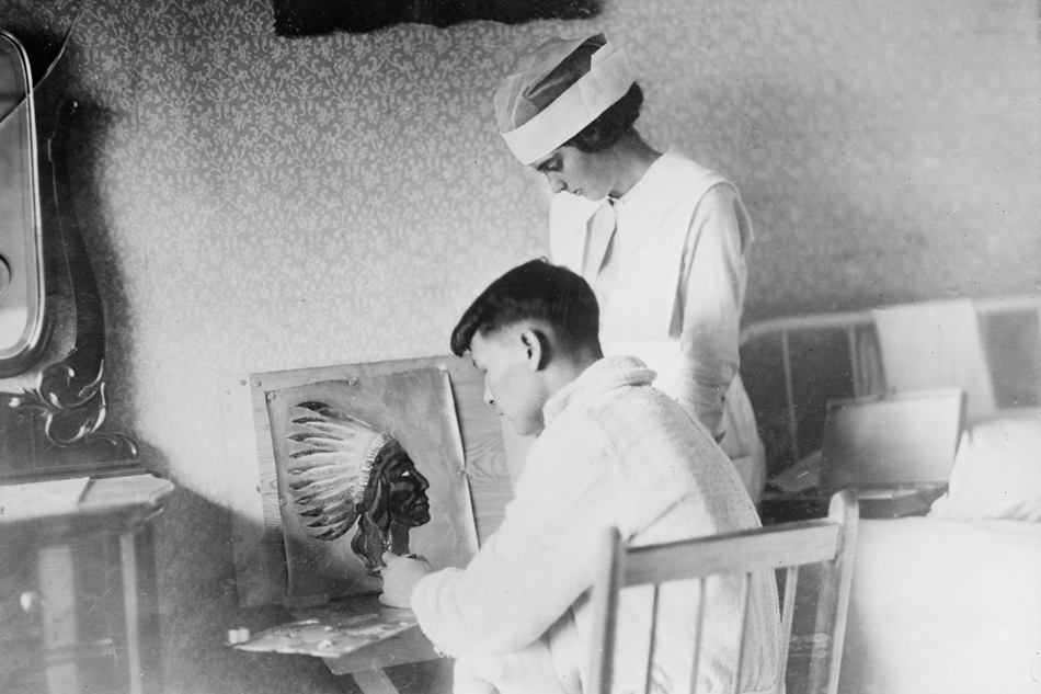 A young Sioux Veteran recovering in hospital, West Baden, Ind., painting with his left hand a portrait of a famous native American chief. His right hand was torn with a shell in the First World War, 1919.
