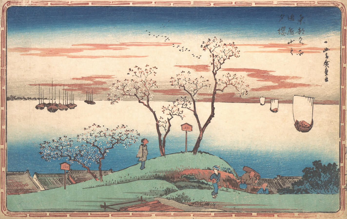 A Universal Truth: All of us can identify with the depiction of this person who, in a quiet moment, pauses to look up at the emerging cherry blossom. The artist has reminded us of the experience of the joy and hope of spring, perhaps after a barren winter – nearly 200 years after it was created. Utagawa Hiroshige (1797-1858) Evening Cherry Blossoms at Gotenyama, 1831.